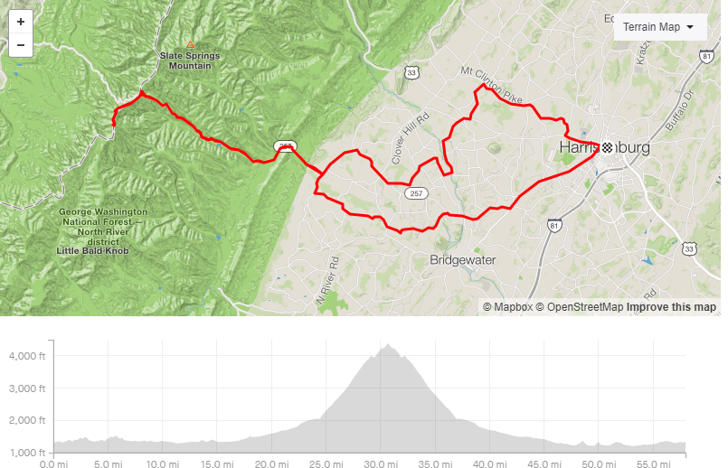 Our route is 58 miles with 4800’ of climbing, and includes beautiful views, rolling hills, and of course, the climb up Reddish Knob.