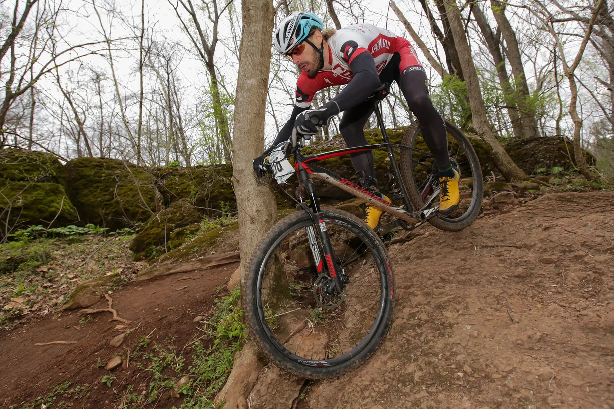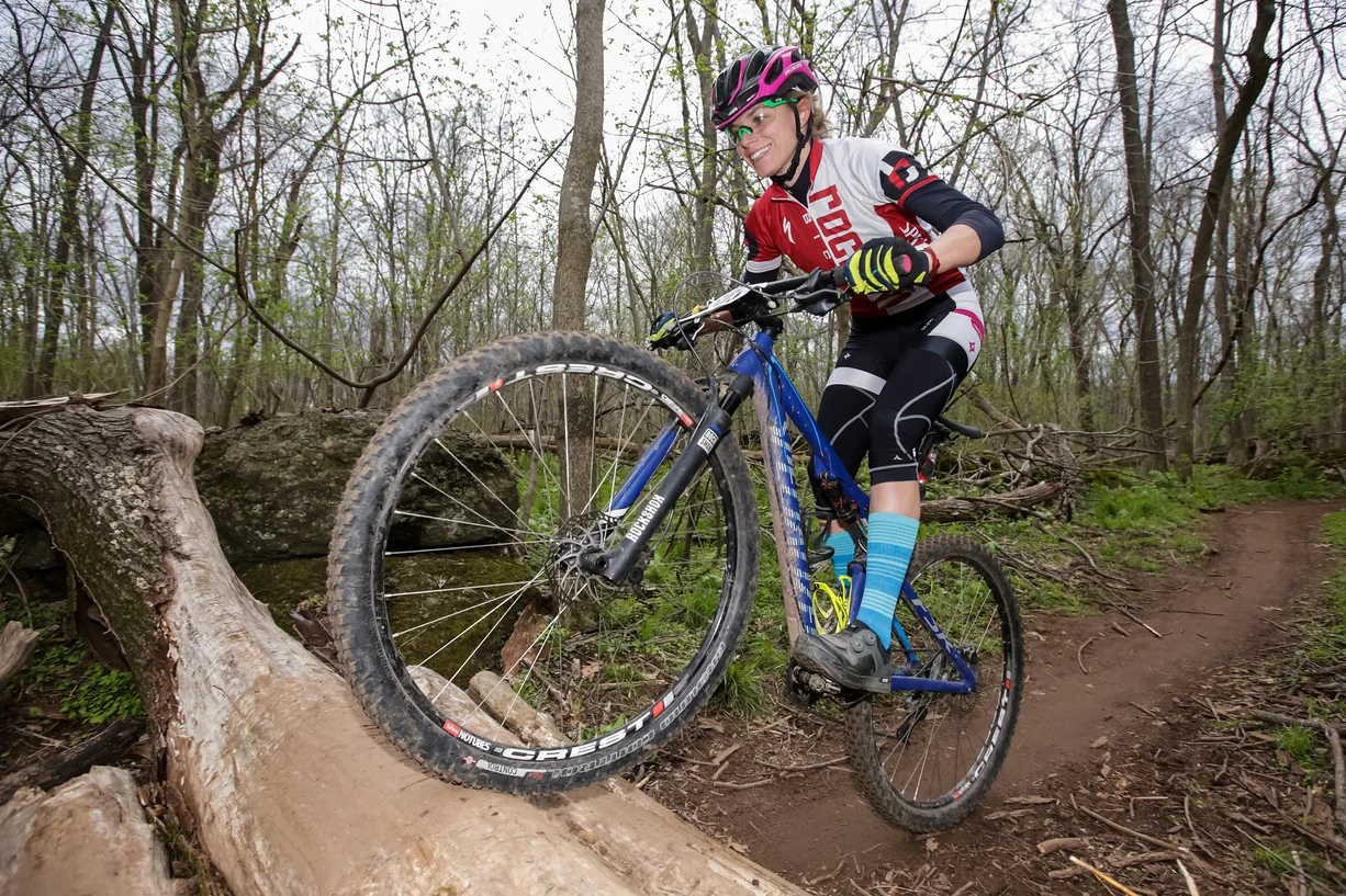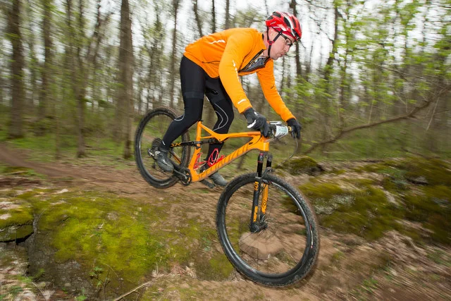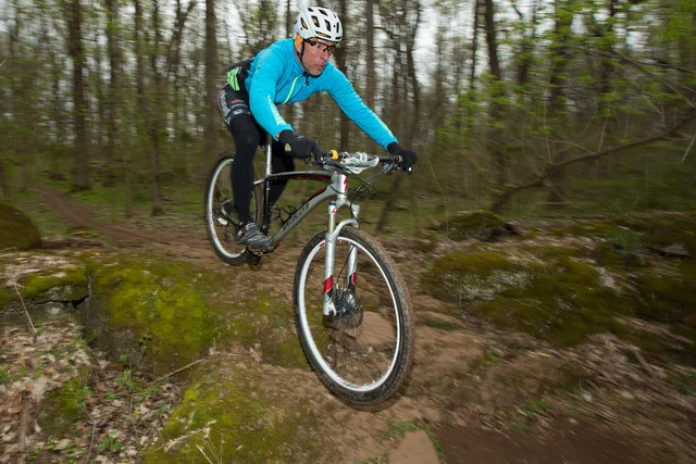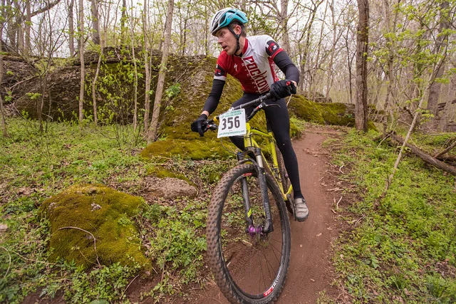 The location of the Leesburg Bakers Dozen is on an almost 500acre plot of private farm land next to the Potomac. The trail is only open this one time, every year. It meanders through portions of rooty wooded forests, columns of BIG pine trees, and open fields. When riding in the fields from one section of forest to the next, riders were blasted by the wind, and sometimes fought to stay upright. In the woods, the singletrack featured logs, rock drops, and smooth swoopy dirt. You could get moving on this trail, and barely touch your brakes if you didn't want to. I think I was smiling the whole time I was out on my laps, the trail was so much fun! My favorite part was riding through the last section of pine trees. The trees were all lined up in rows upon rows, like huge pillars. They were so close together it was much darker in this section than anywhere else, but when the sun shown through them, the lighting between the trunks was incredible. The trail was clear and smooth through here, as well, and so you could get going 20-30mph easy and not touch your brakes for a good bit! It was exhilarating!