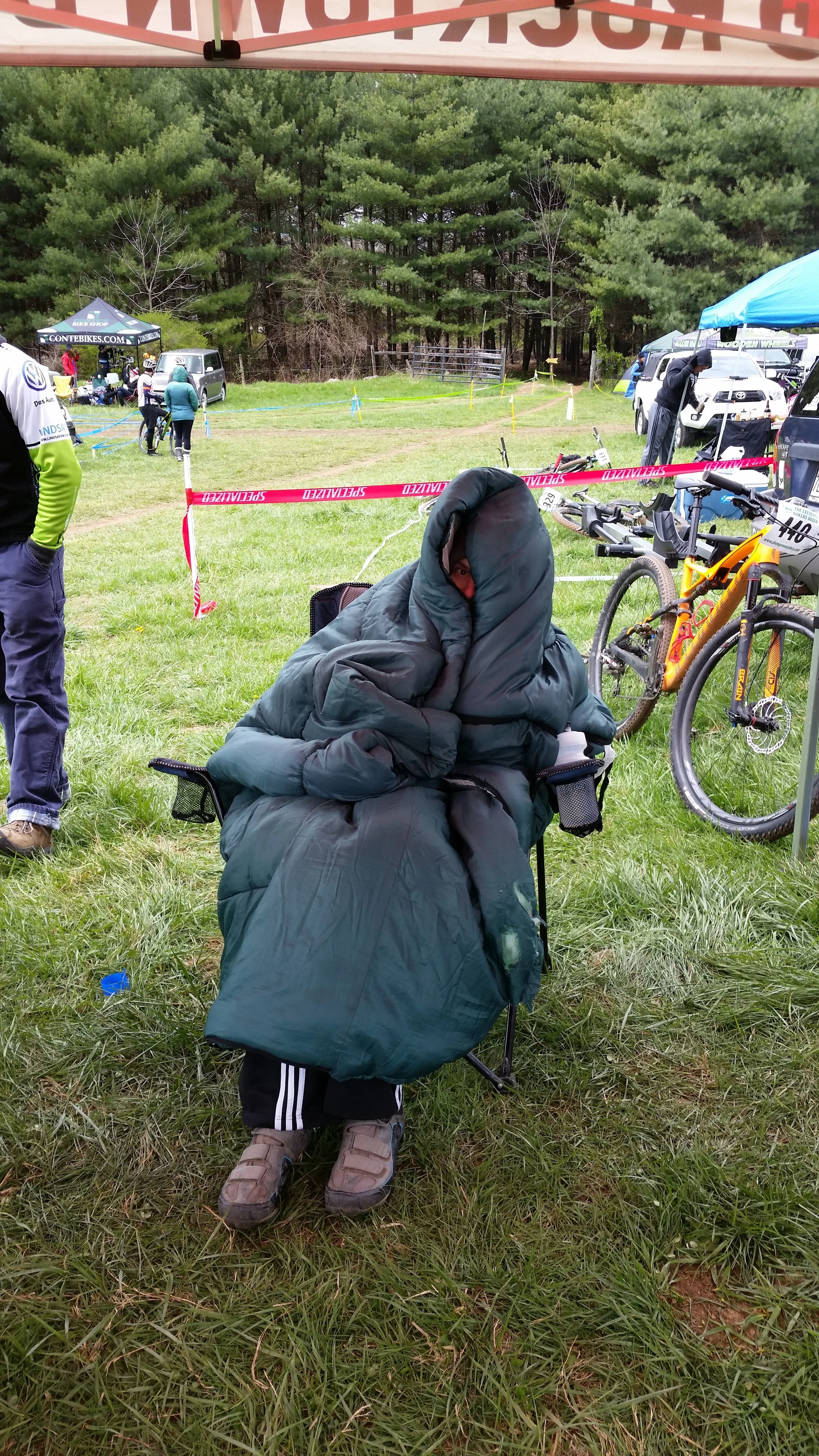 Adam started our team off for the day, and put in the fastest lap times for our team! Our staging area was set up so that we could see our teammates go into the last bit of piney woods section and get the next rider ready without having a chaotic passing of the "baton". Participating the the 3-person team seems to be the most fun way to complete this relay. The other two riders get to hang out and chat while the third person is out on the race course. This year was especially fun with having two Rocktown teams there... More people to empathize with about staying warm and out of the wind while waiting for your turn to ride.